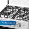 DescripciónCocina a gas de 4 quemadores, color negro, tapa de vidrio templado