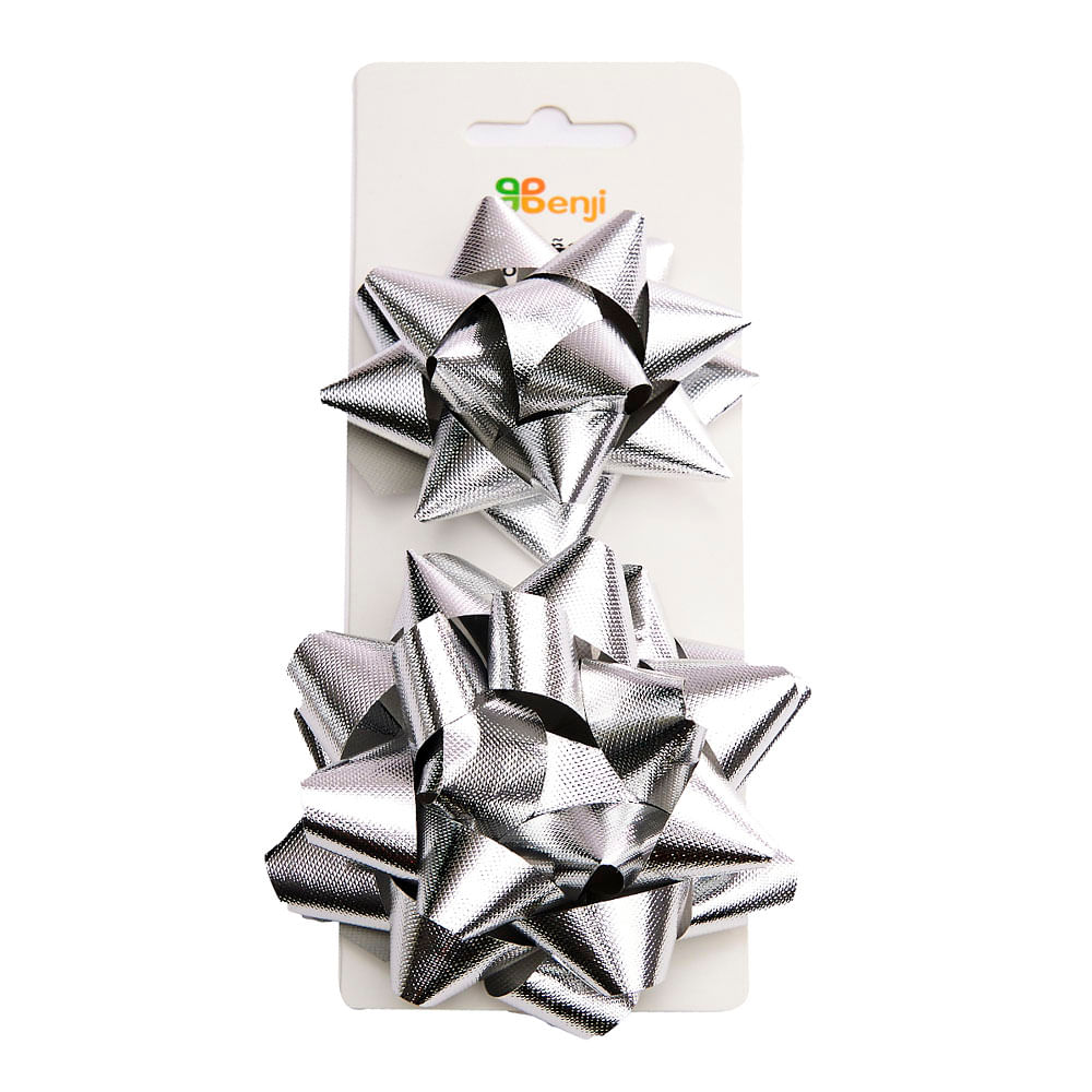 DescripciónJuego x 2 moños para regalos (1 chico de 3 pulgadas + 1 grande de 4 pulgadas) en cinta relieve de 18mm de ancho color silver