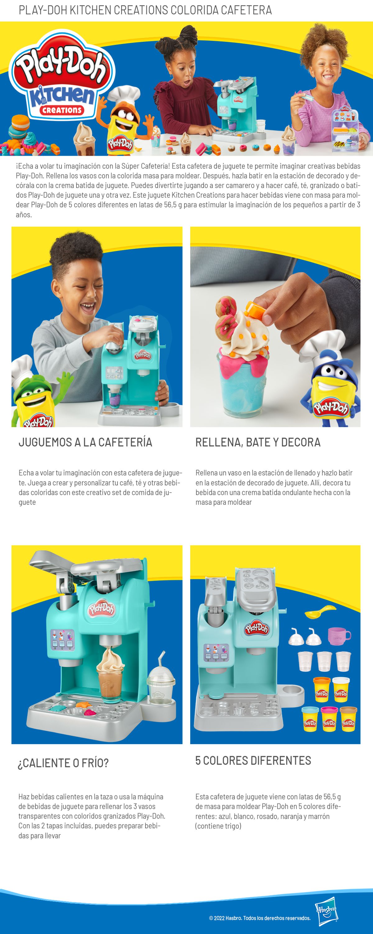 economía S/ 24.00| Descripción | ![]() Conoce más acerca del producto¡Echa a volar tu imaginación con la Súper Cafetería! Esta cafetera de juguete te permite imaginar creativas bebidas Play-Doh. Rellena los vasos con la colorida masa para moldear. Después, hazla batir en la estación de decorado y decórala con la crema batida de juguete. Puedes divertirte jugando a ser camarero y a hacer café, té, granizado o batidos Play-Doh de juguete una y otra vez. Este juguete Kitchen Creations para hacer bebidas viene con masa para moldear Play-Doh de 5 colores diferentes en latas de 56.5 gramos para estimular la imaginación de los pequeños a partir de 3 años. |